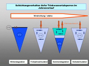 Theroretisch gibt es vier Jahreszeiten: Die Stagnation des Wasserkörpers bei Eisbedeckung im Winter, die Zirkulation im Frühjahr und im Herbst und im Sommer wiederum eine stabile thermische Schichtung, weil dann das warme, leichtere Wasser oben bleibt.